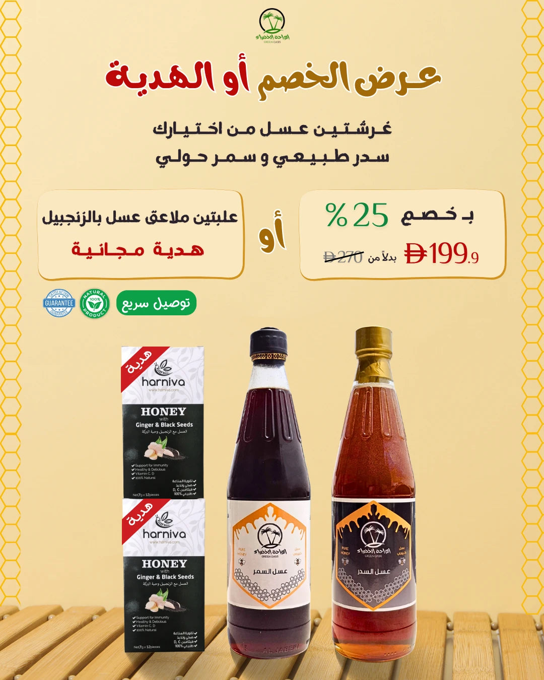 تأسست شركة الواحة الخضراء بشغف لمشاركة كنوز منطقتنا، وتقدم تشكيلة فاخرة من العسل الطبيعي والتمور الفاخرة وخلطات العسل المميزة. كل منتج نقدمه لكم يُجسّد التزامنا بالجودة والتقاليد والضيافة العربية الأصيلة.